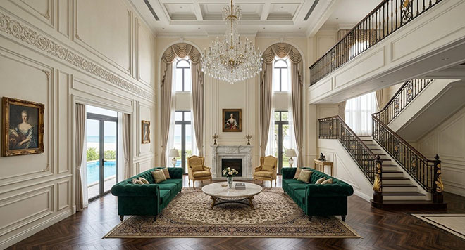 Nội thất bên trong các căn song lập tại đây hướng tới sự xa hoa, uy nghi. Không gian thường sử dụng các chi tiết phào chỉ trần tường tinh xảo, kết hợp với các vật liệu truyền thống cao cấp như gỗ gõ đỏ, đá Marble và đèn chùm pha lê cỡ lớn. Phòng khách được thiết kế với trần cao và hệ cửa vòm, tạo nên một không gian tiếp khách mang đậm phong thái quý tộc Châu Âu.